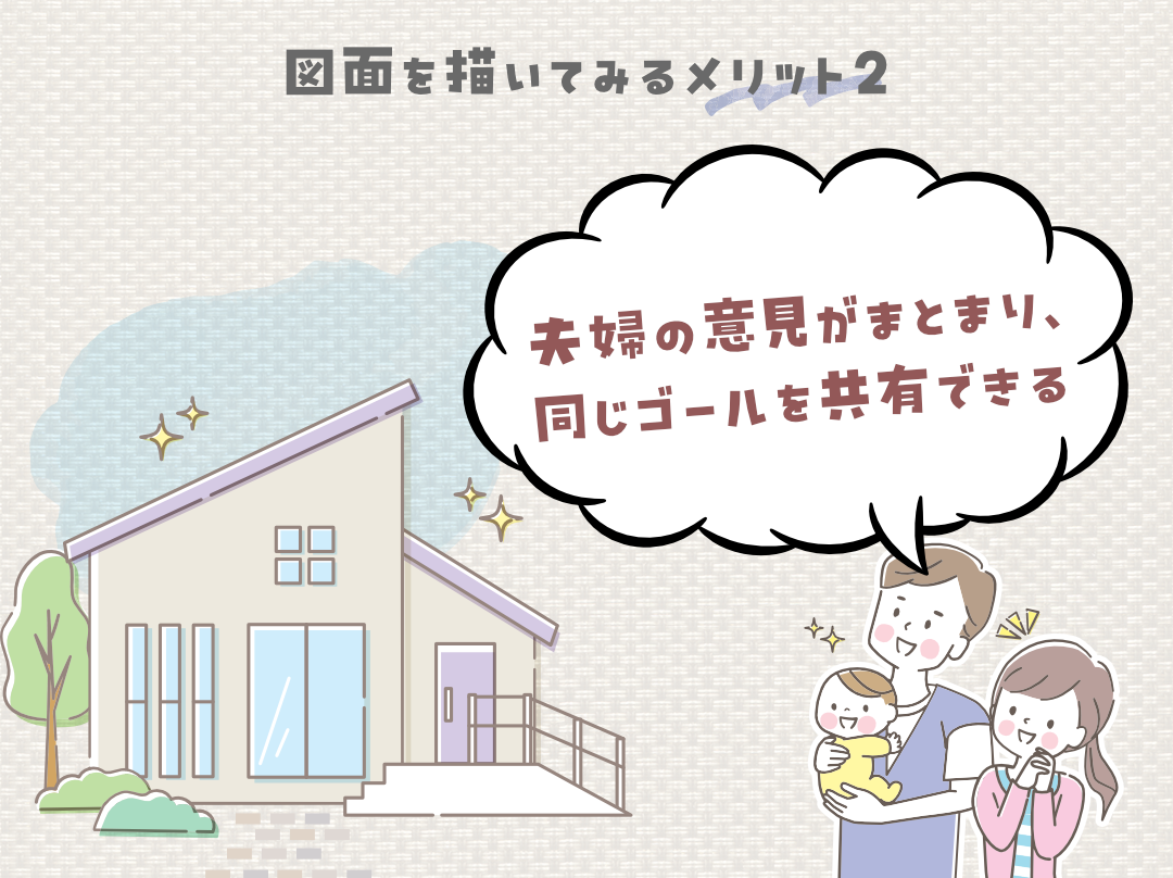 ご夫婦で「どんな家がいいか」を話し合っても、言葉だけでは意見が食い違うことも。図面という共通の”絵”を見ながら話し合うことで、「リビングはこの配置がいいね」「パパの趣味のスペースも少し作ろう」と、お互いの希望を楽しくすり合わせることができます。