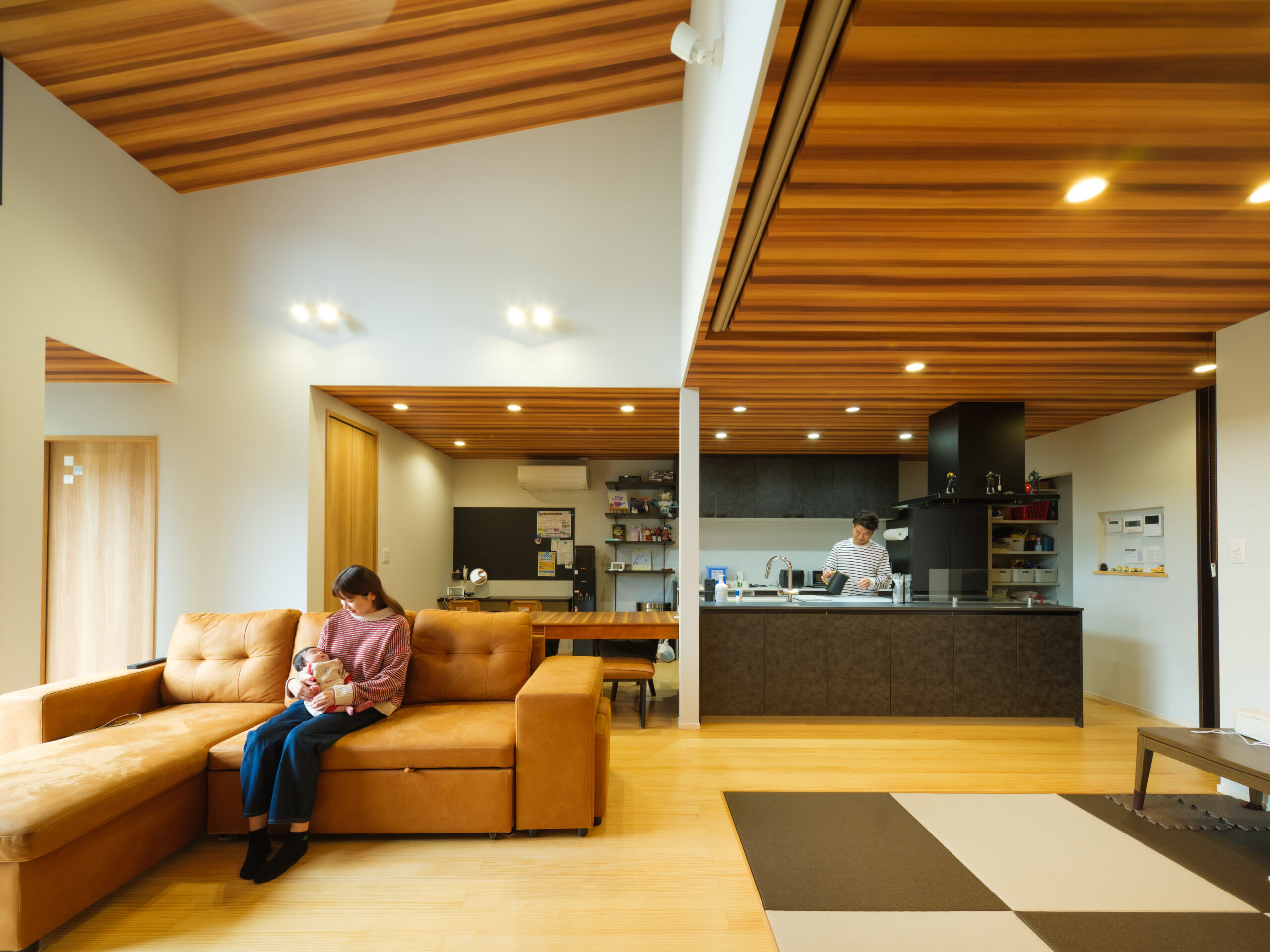 木目の天井とダークトーンのアイランドキッチンが美しく調和した、デザイン性と使いやすさを兼ね備えたキッチンスペースです。天井までつながる木目が空間に一体感を生み、キッチンに立つ時間そのものが心地よく感じられます。