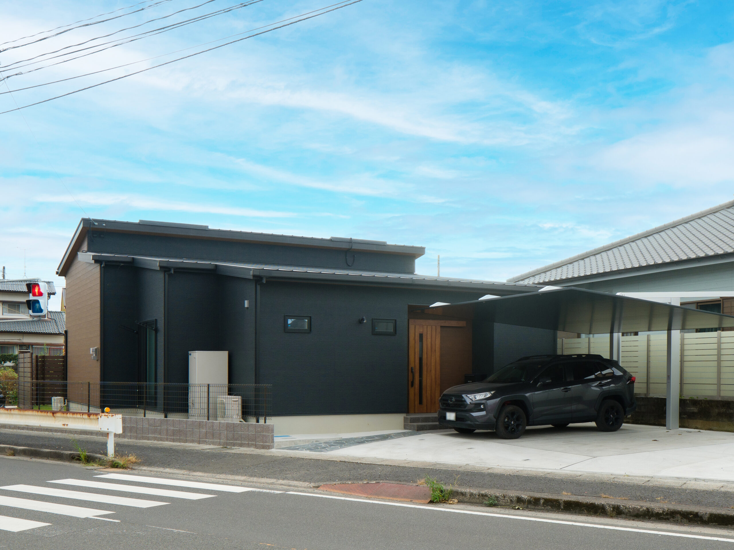 屋根の勾配を抑えたシンプルなフォルムが、街並みに自然と馴染みながらも、しっかりと存在感を放っています。