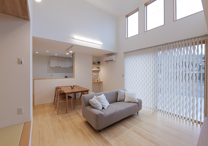 帖佐小学校から徒歩3分! 吹き抜けで開放感をプラス。 自然素材にこだわった平屋建