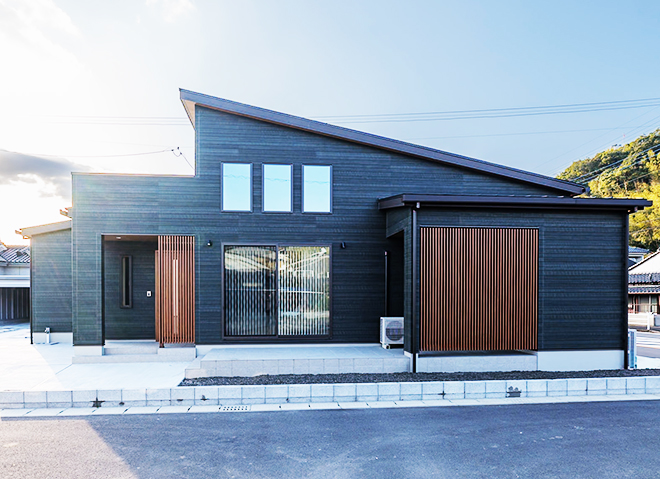 デザイン性も重視し、平屋建でも存在感のある外観を実現。 なごみ工務店らしい自然素材の雰囲気を存分に活かした強く優しい雰囲気です。