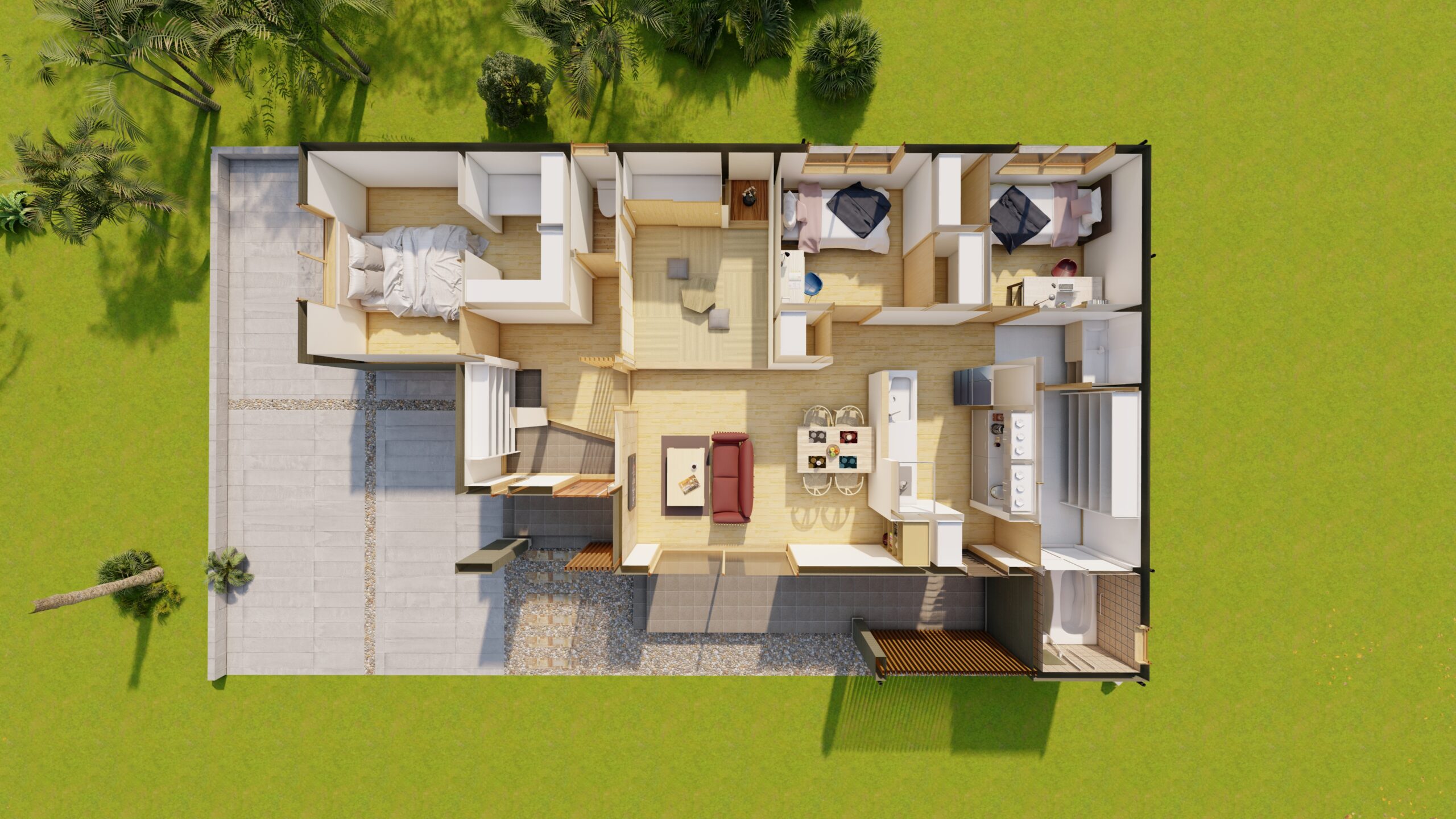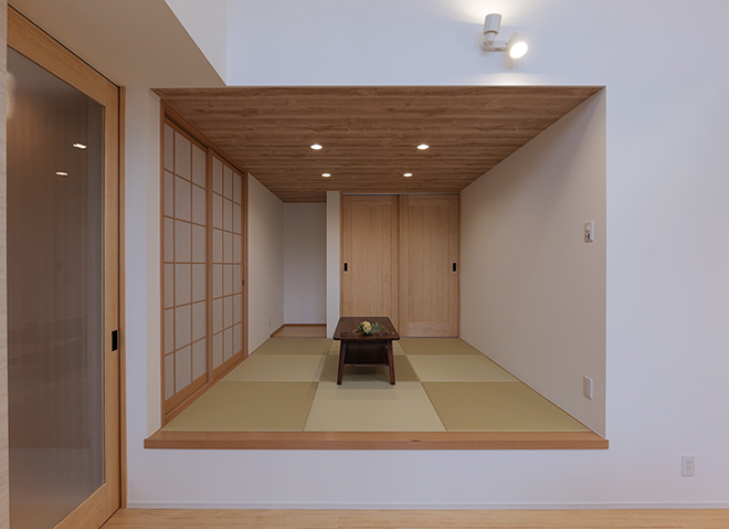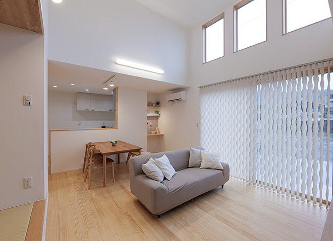 平屋建なのに吹き抜け天井を取り入れることで、天窓から優しい自然光が差し込み、空間全体を明るくします。